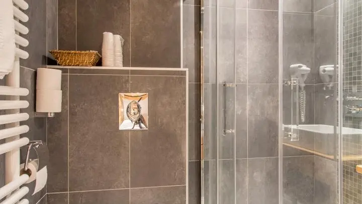 Salle d'eau avec douche, une vasque sur meuble, sèche-serviettes, wc.