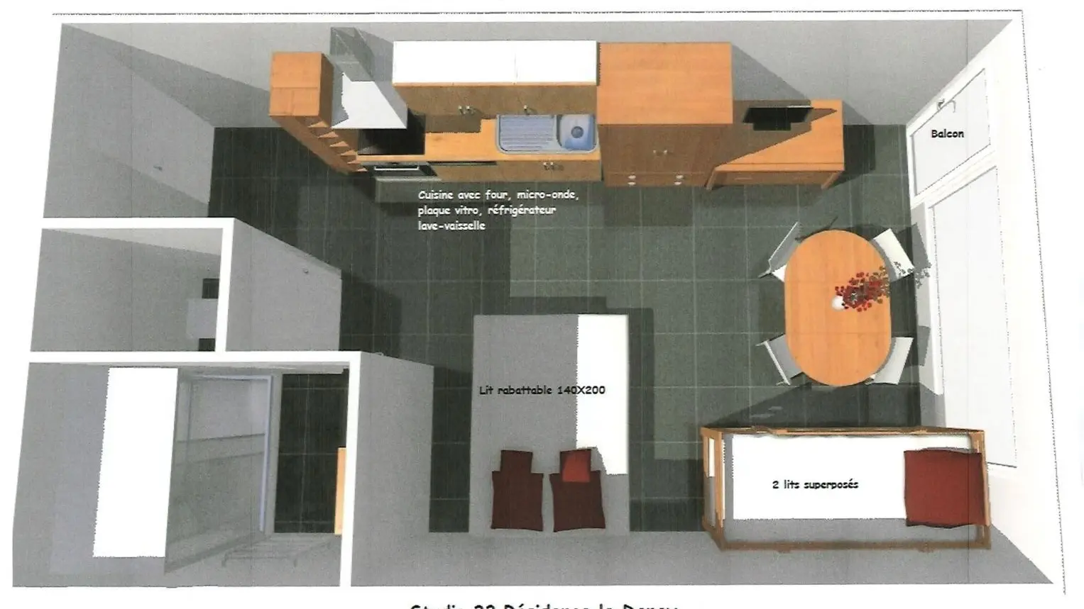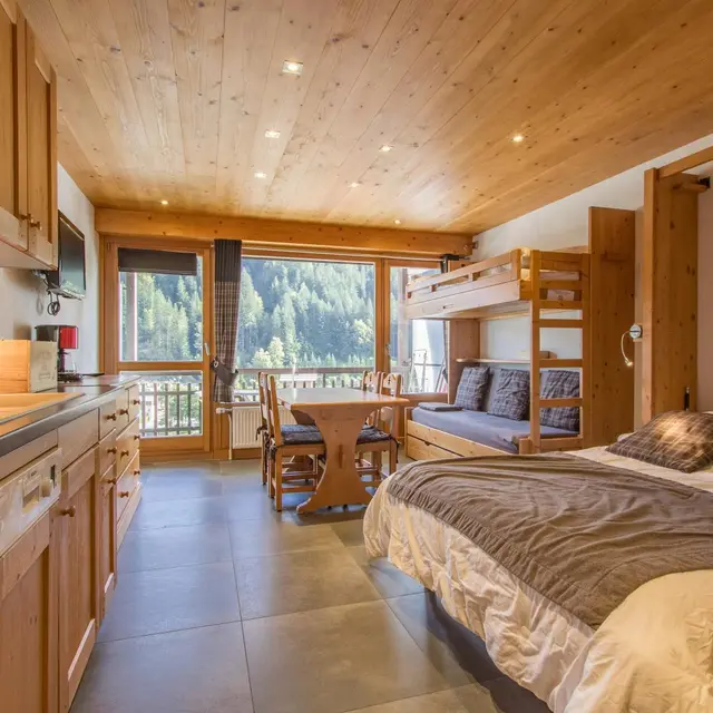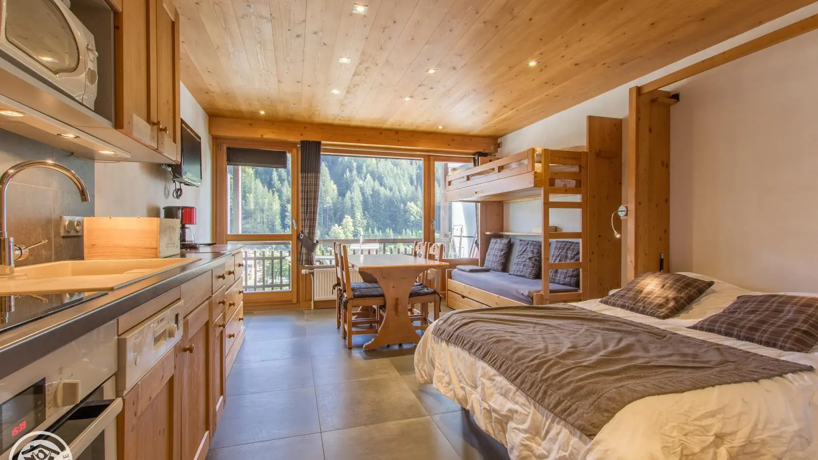 Cuisine équipée ouverte sur le séjour et l'espace nuit : table repas, télévision,1 canapé avec matelas 80x190cm, 1 lit en hauteur 80x190cm, 1 lit double escamotable 140x190cm. Baie vitrée donnant accès au balcon.