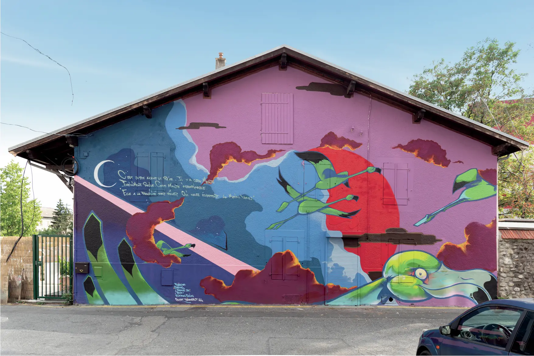 L’auteur et écrivain, Florian Eglin s’associe avec son compère Serval, artiste peintre, à travers le projet Fabulae Genavenses : les fables du Grand Genève, qui peuplent la région de leurs histoires, de leurs contes et fables. Les mots qui s’allient à l’image, du texte au mur. Improbables et percutants, comme l’envol d’une nuée de flamands verts.
