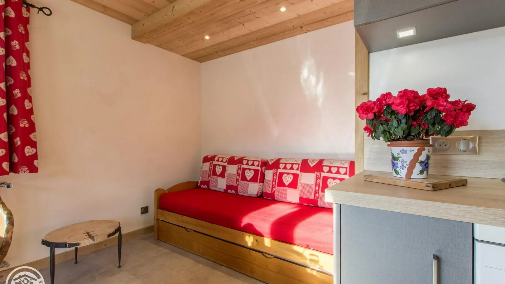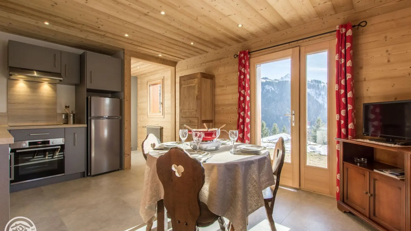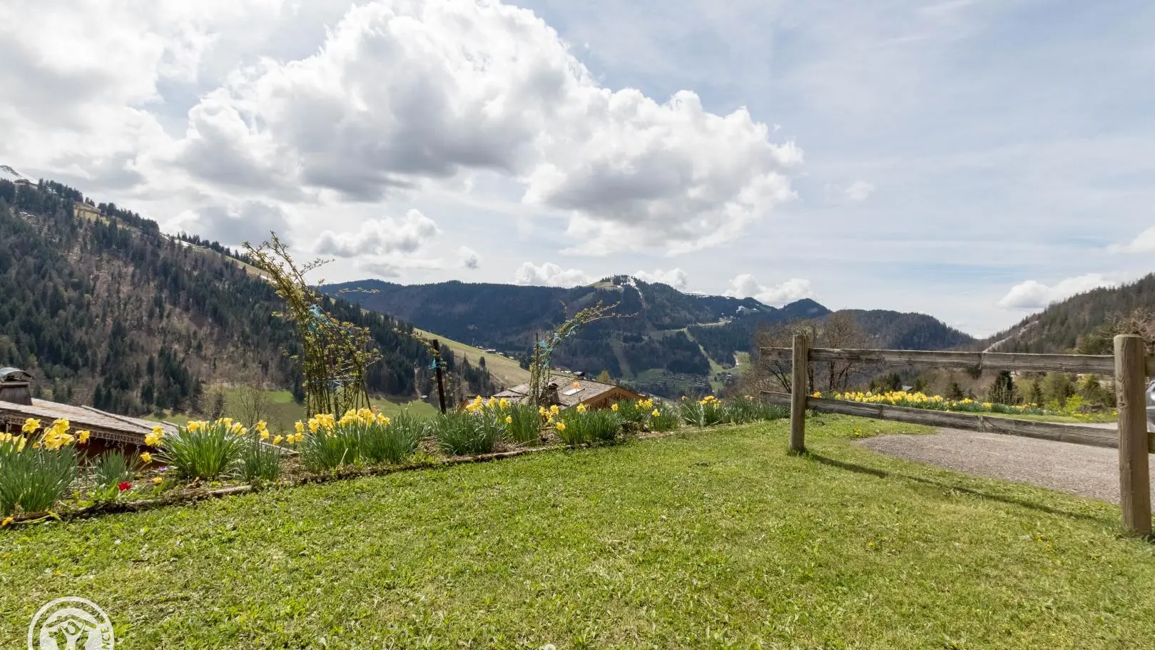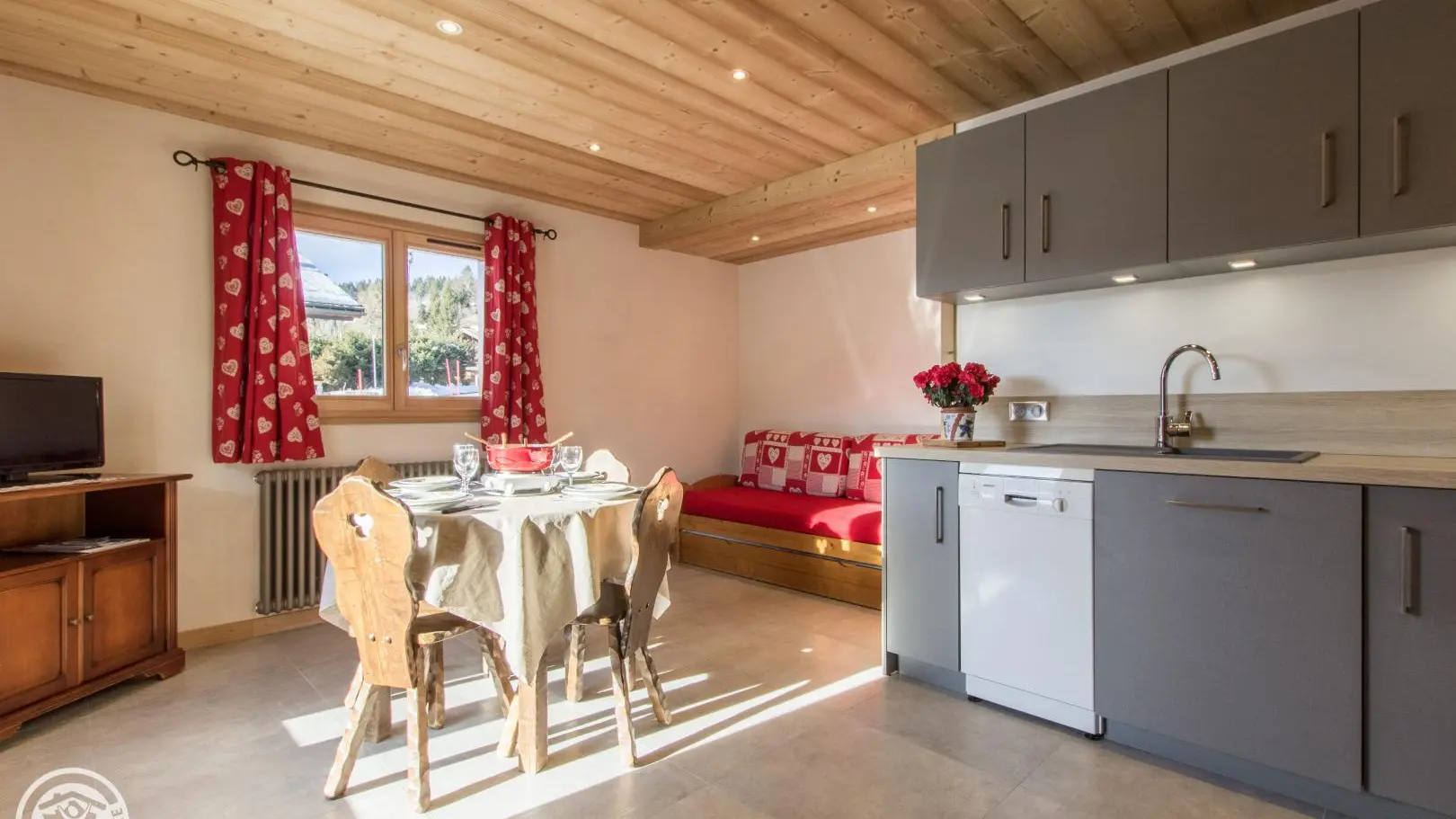 Gîte de 36m² aménagé de plain-pied au rez-de-chaussée d'un chalet comprenant un logement propriétaire à l'étage. Entrée indépendante. Secteur calme sur les hauteurs de La Clusaz