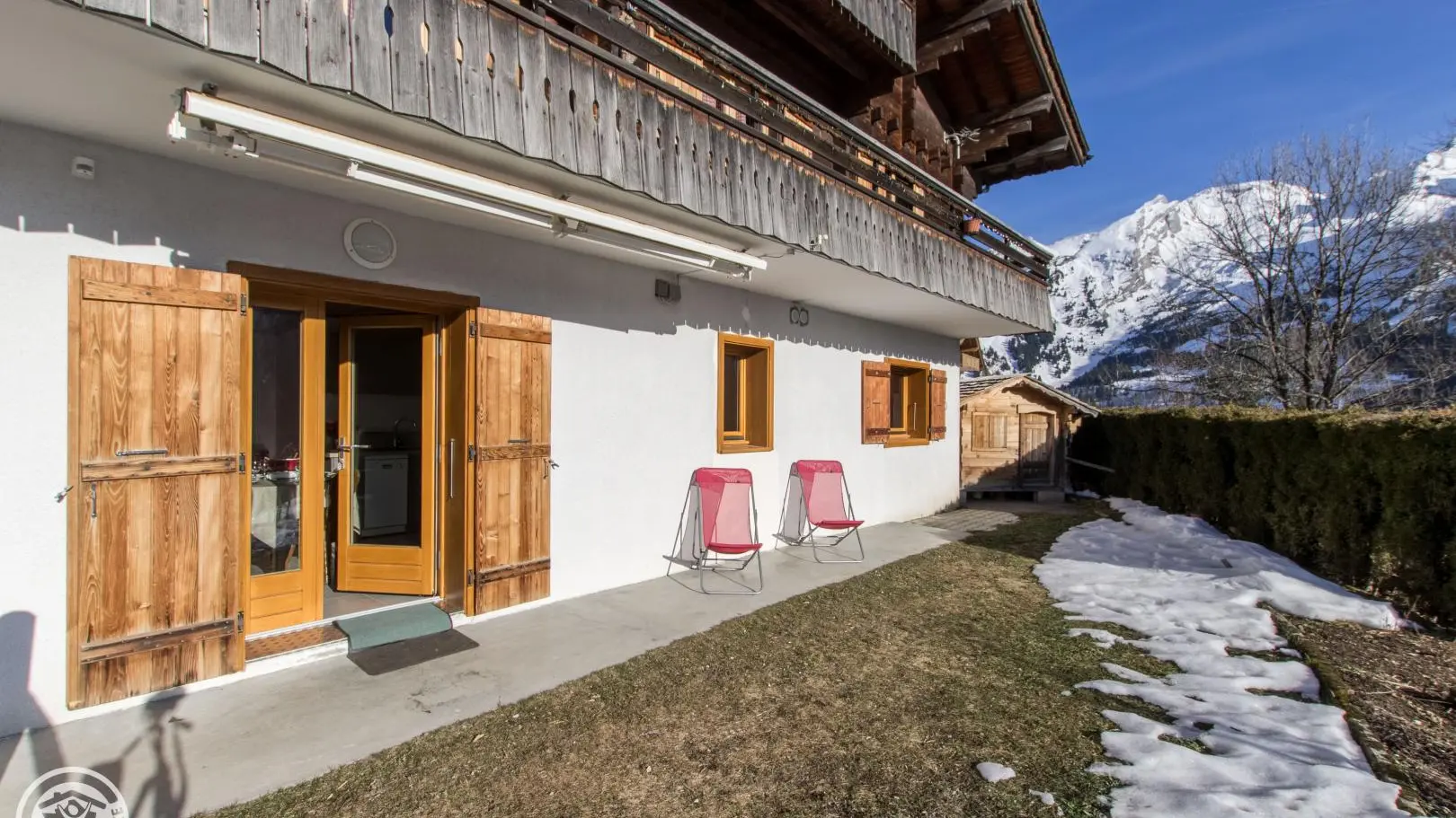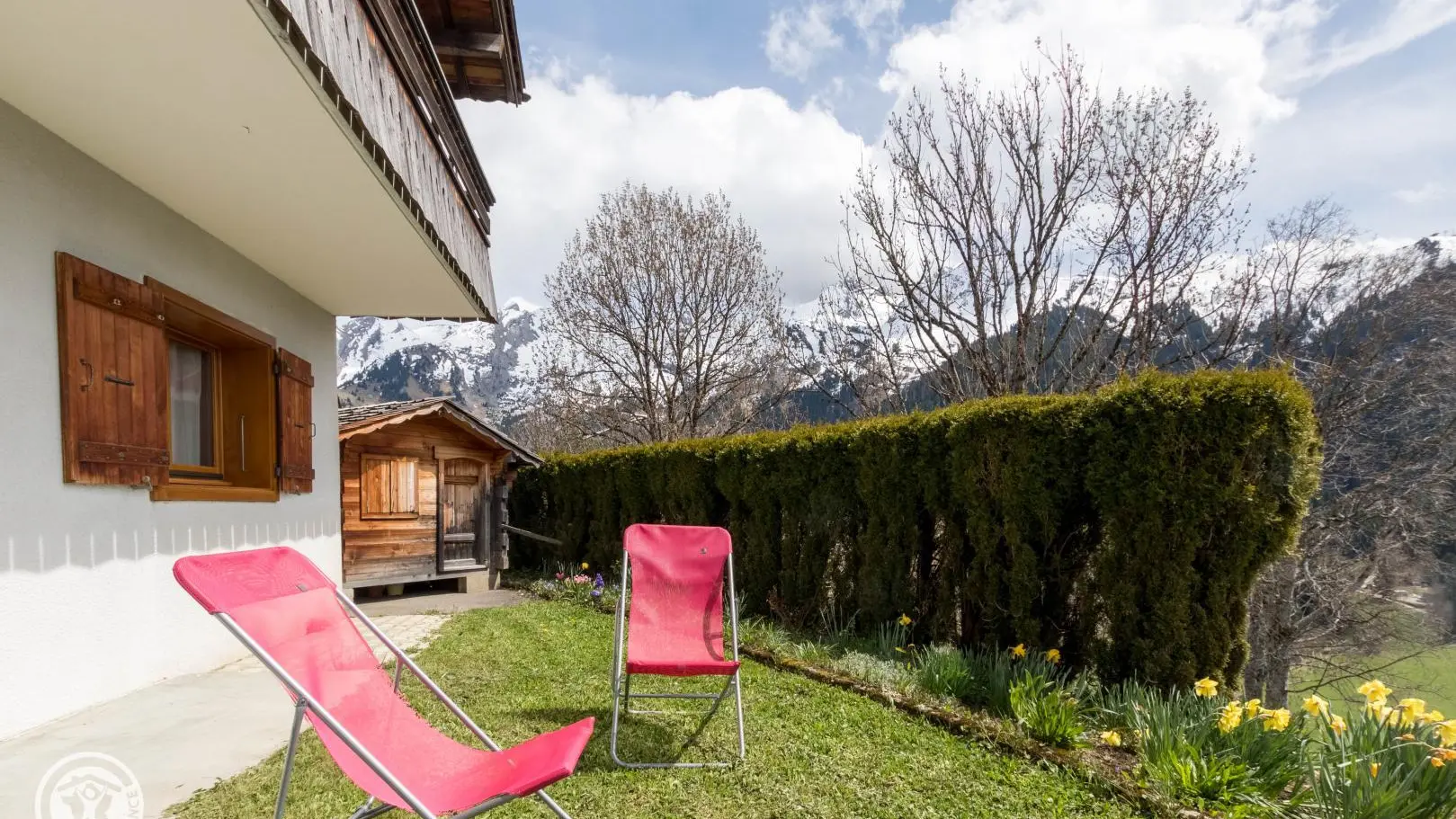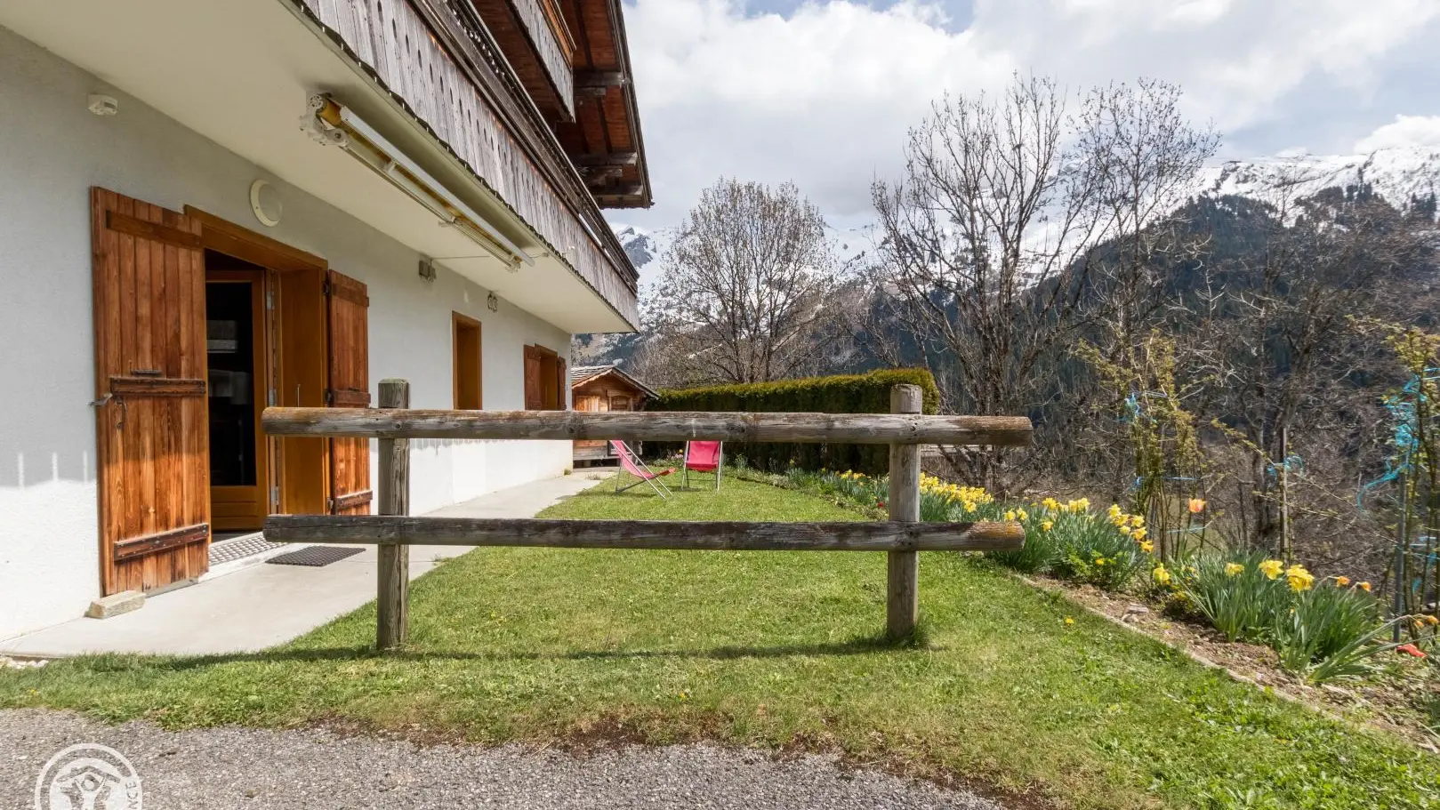 Coin terrasse et jardin avec salon de jardin, transats, store, plancha. Très belle vue sur les montagnes, le village et les pistes de ski l'hiver.