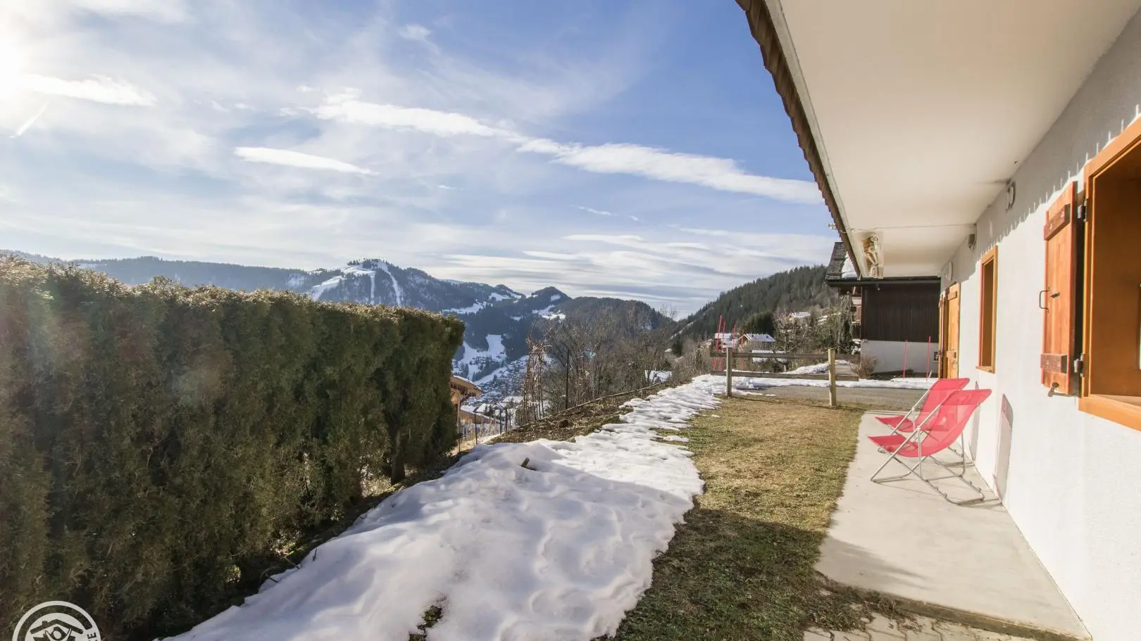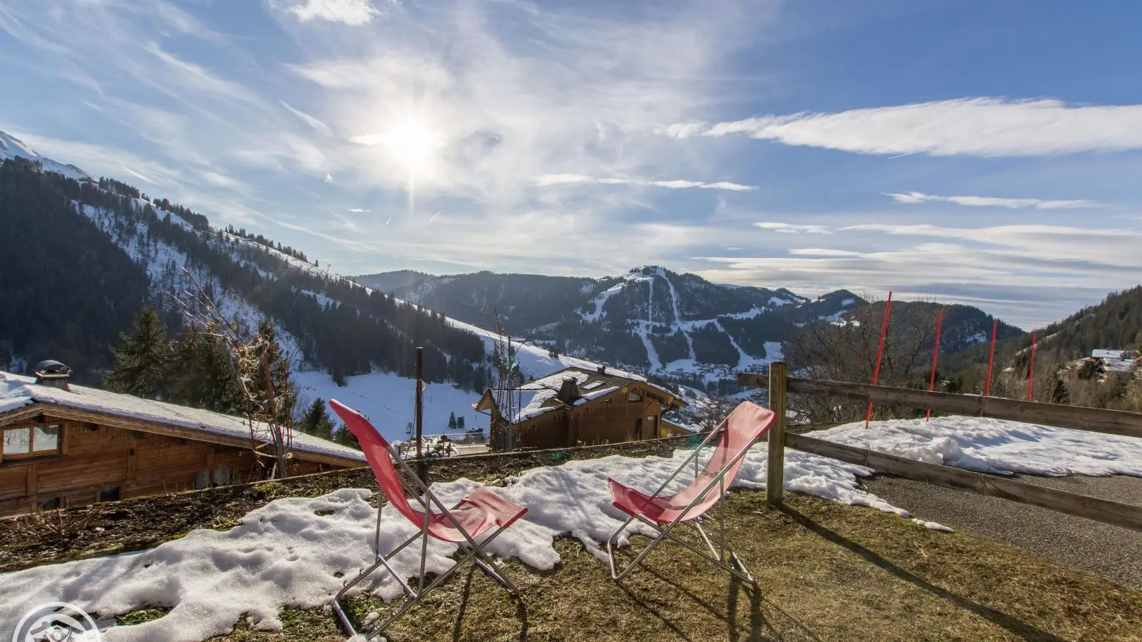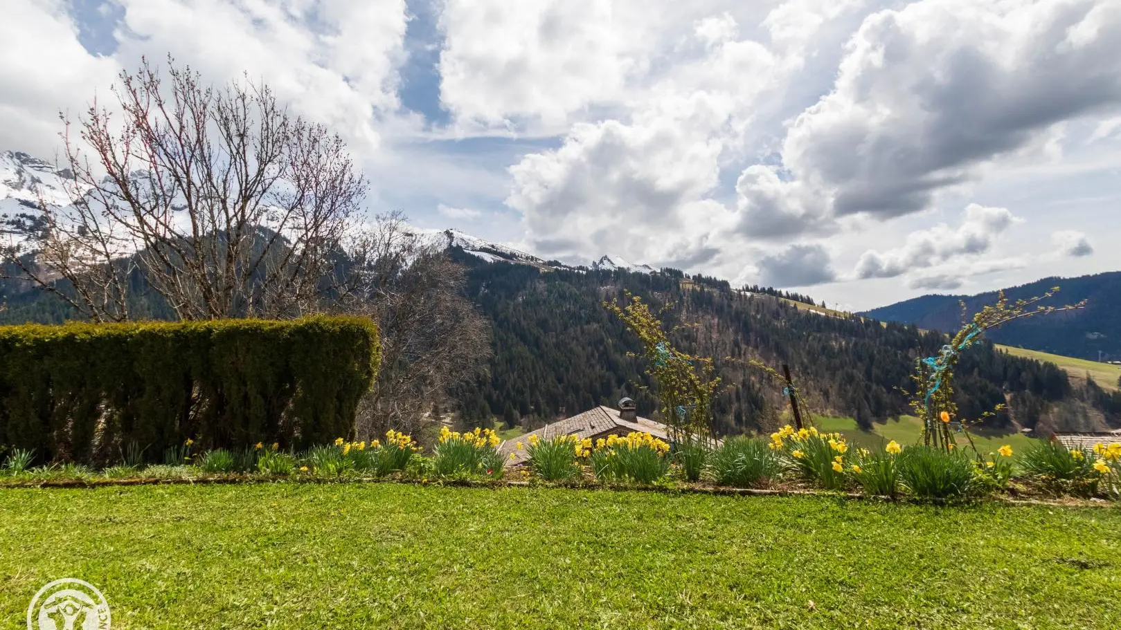 Coin terrasse et jardin avec salon de jardin, transats, store, plancha. Très belle vue sur les montagnes, le village et les pistes de ski l'hiver.